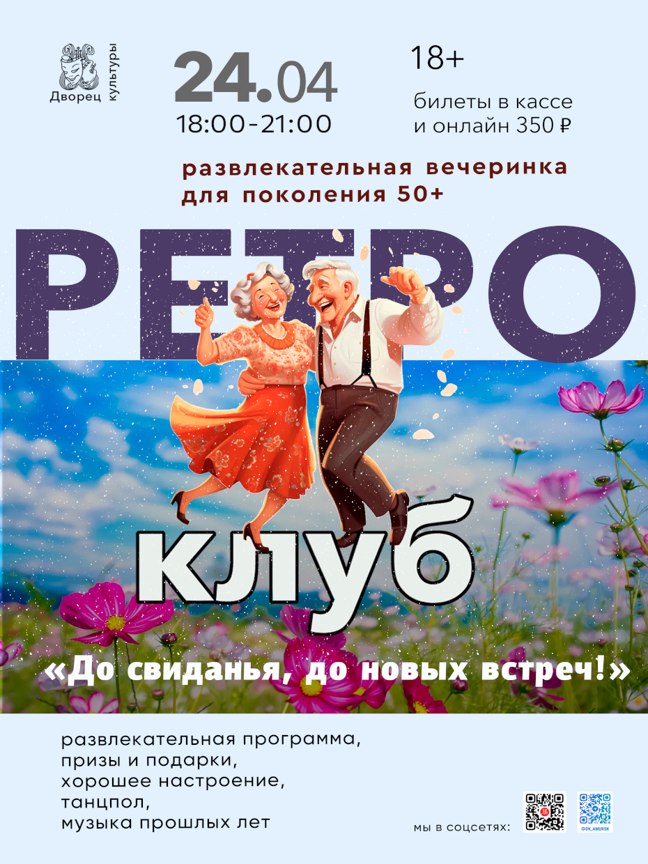 Ретро-клуб Дворца Культуры приглашает любителей хорошего настроения на заключительную встречу сезона. Впереди – приятные летние заботы, перед которыми нужно зарядиться доброй энергией в кругу близких людей!