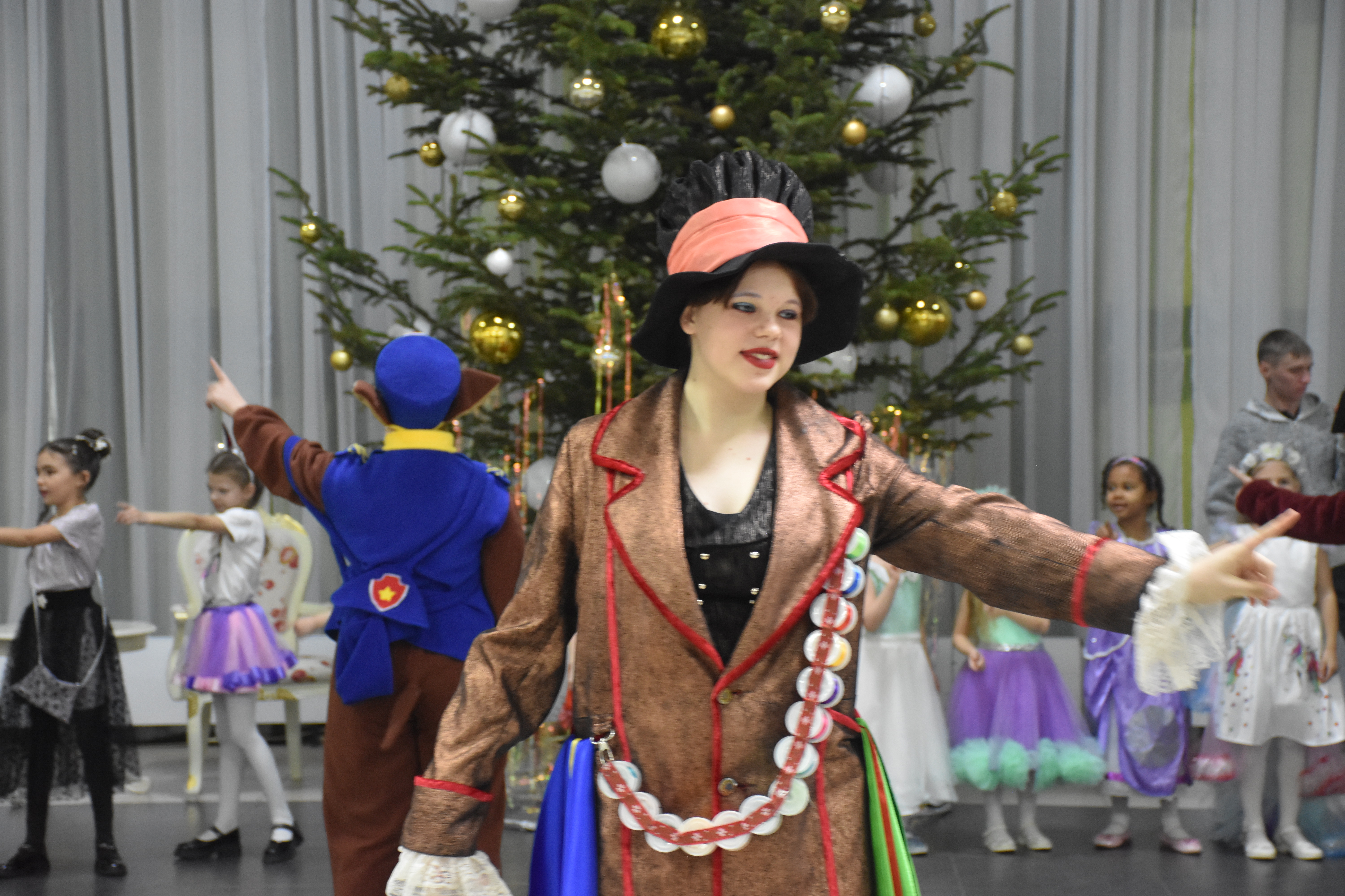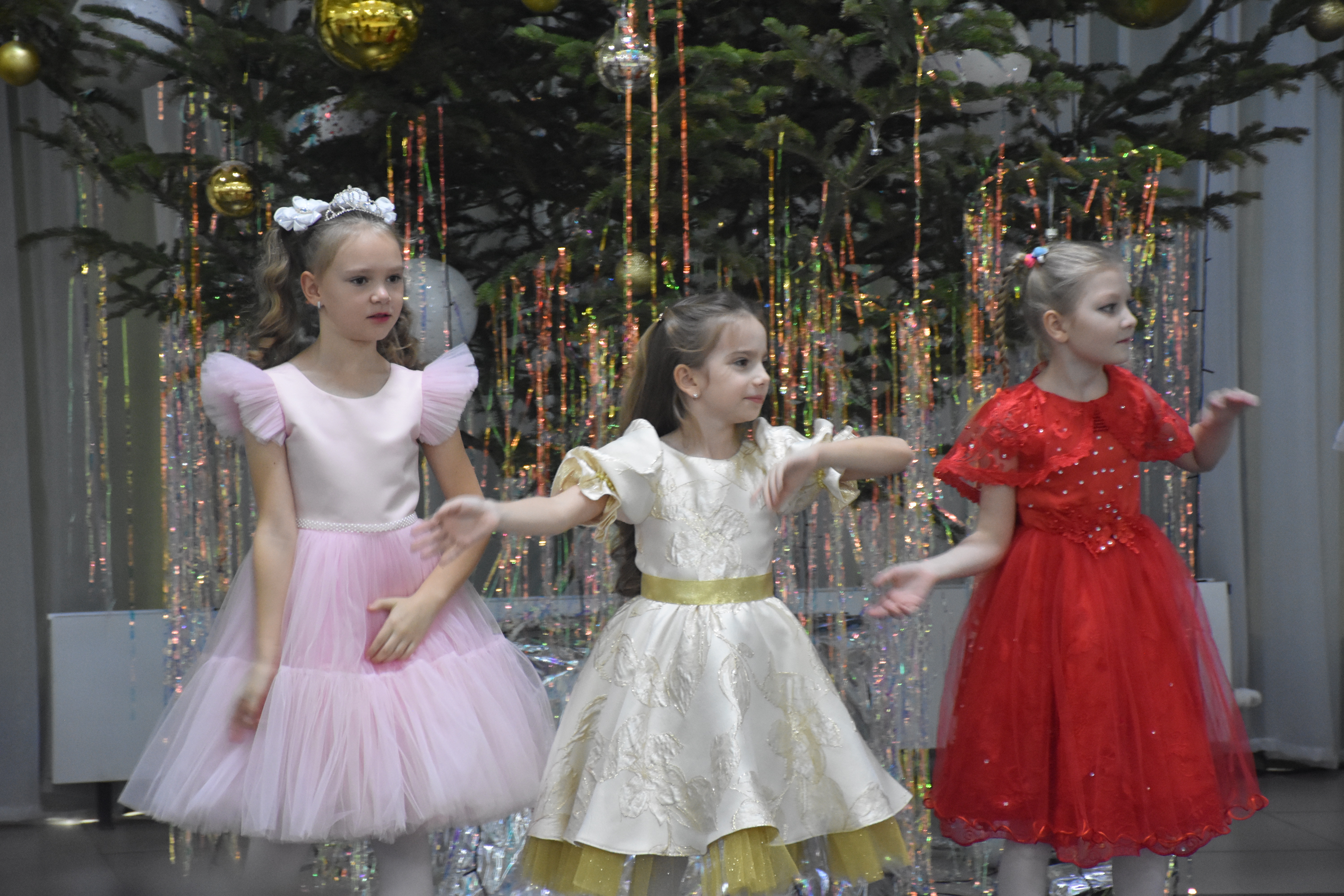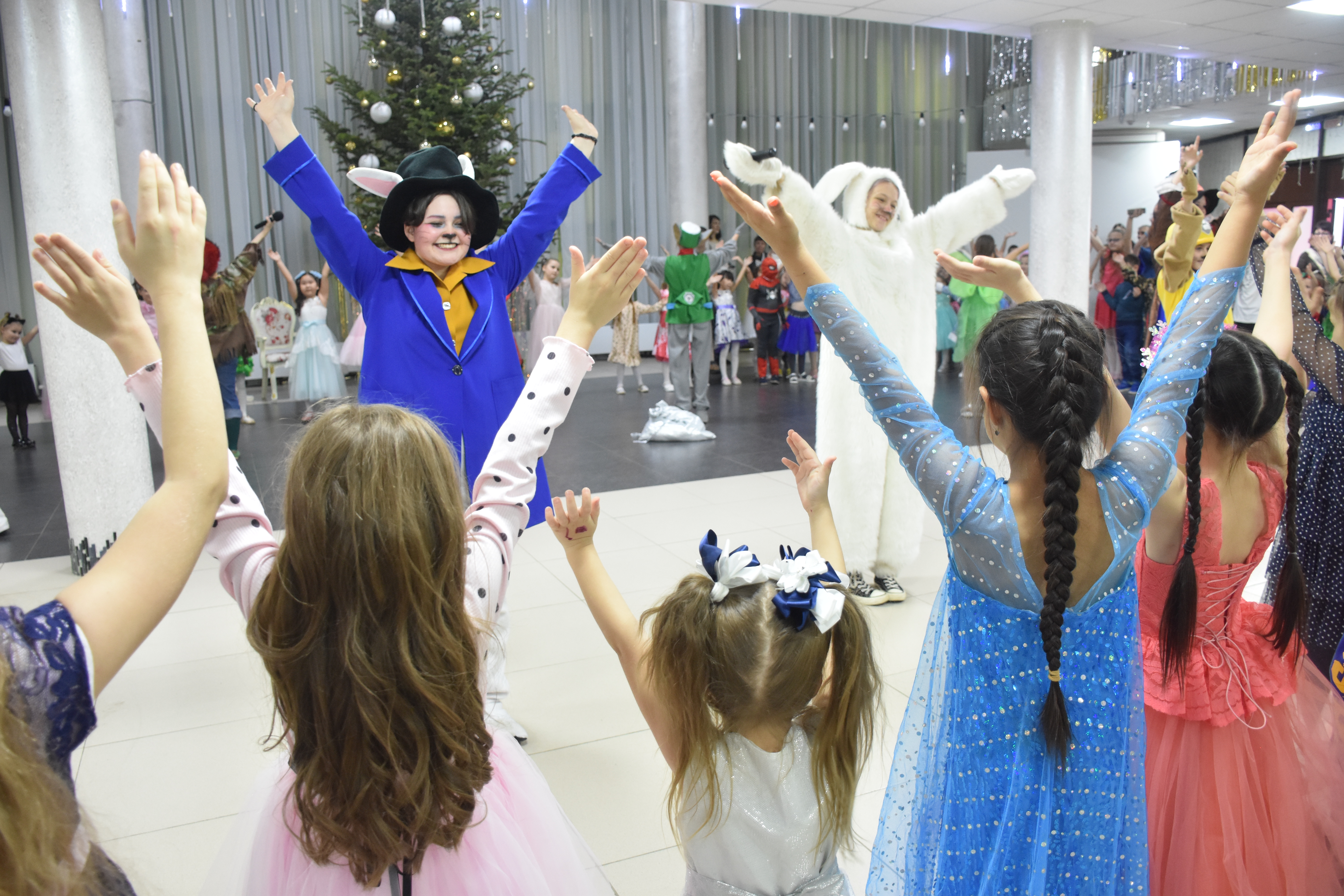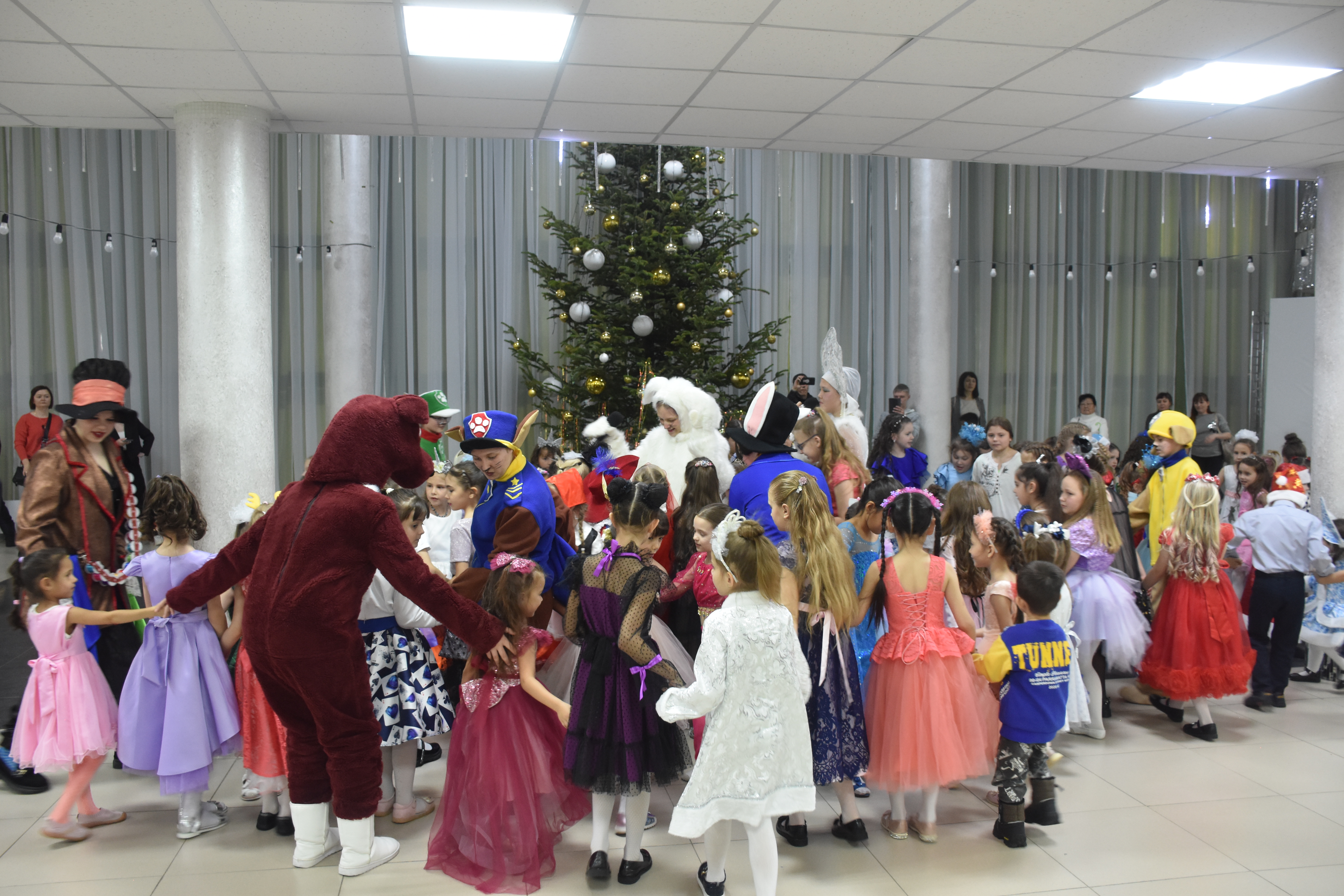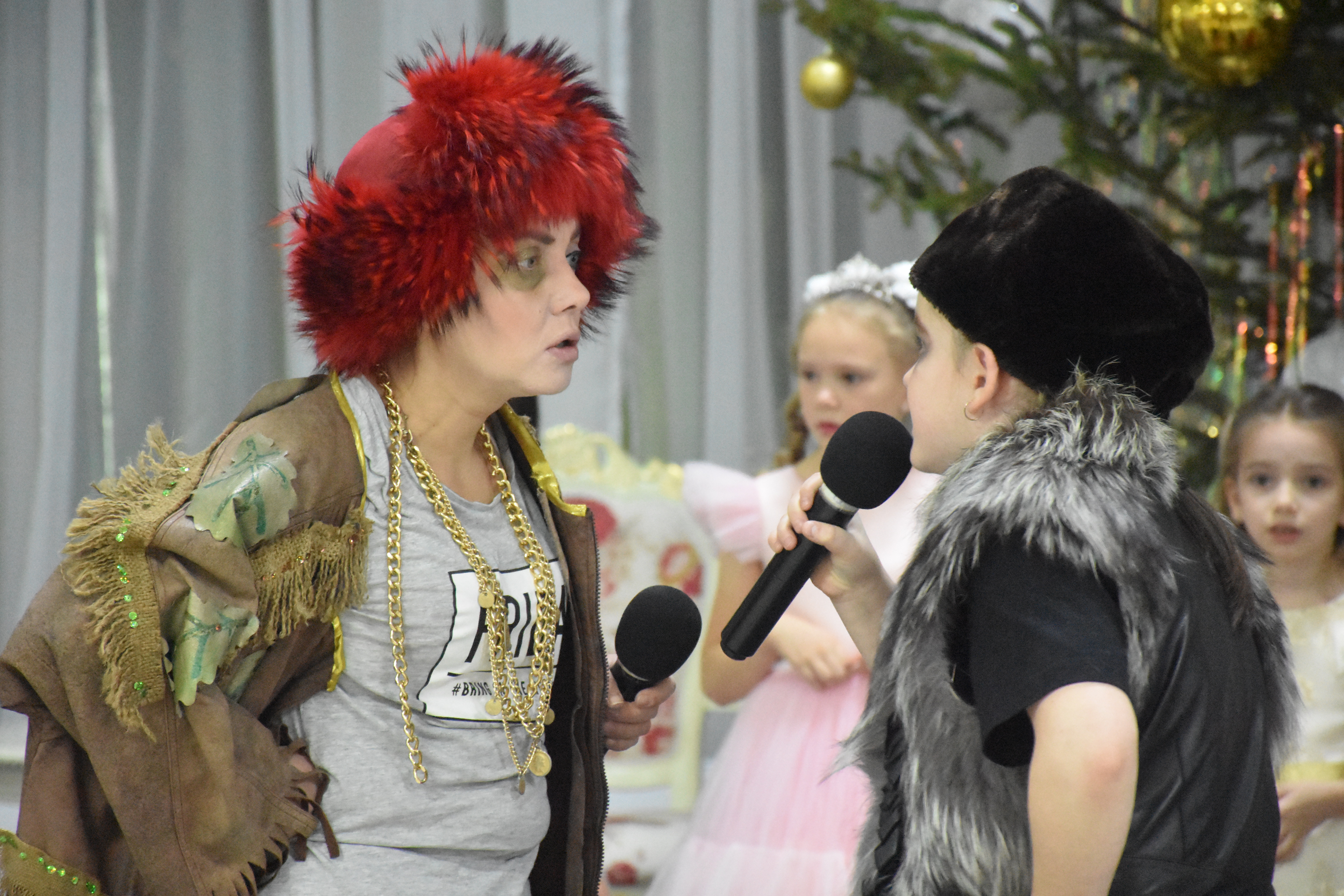 В 14.00. в паркетном зале состоялось театрализованное представление «Как Заяц мечтал стать звездой». Дети с удовольствием наблюдали за историей «Зайца», который мечтал стать знаменитым и был обманут лесными разбойниками-«продюсерами», но как в любой новогодней сказке с появлением Снегурочки и Деда Мороза всё закончилось хорошо. Вместе с главными героями дети с играли, танцевали, зажгли огни на елке, водили хоровод и конечно же читали стихи, которые так старательно учили для Дедушки Мороза.