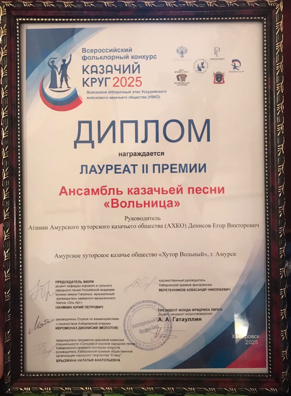 21 сентября в Хабаровской филармонии состоится финал Войскового отборочного этапа Всероссийского фольклорного конкурса Уссурийского войскового казачьего общества «Казачий круг» собрал лучших казачьих исполнителей Дальнего Востока, в том числе ансамбль казачьей песни «Вольница» Дворца культуры, руководитель – Атаман Хутора «Вольный» Егор Денисов.