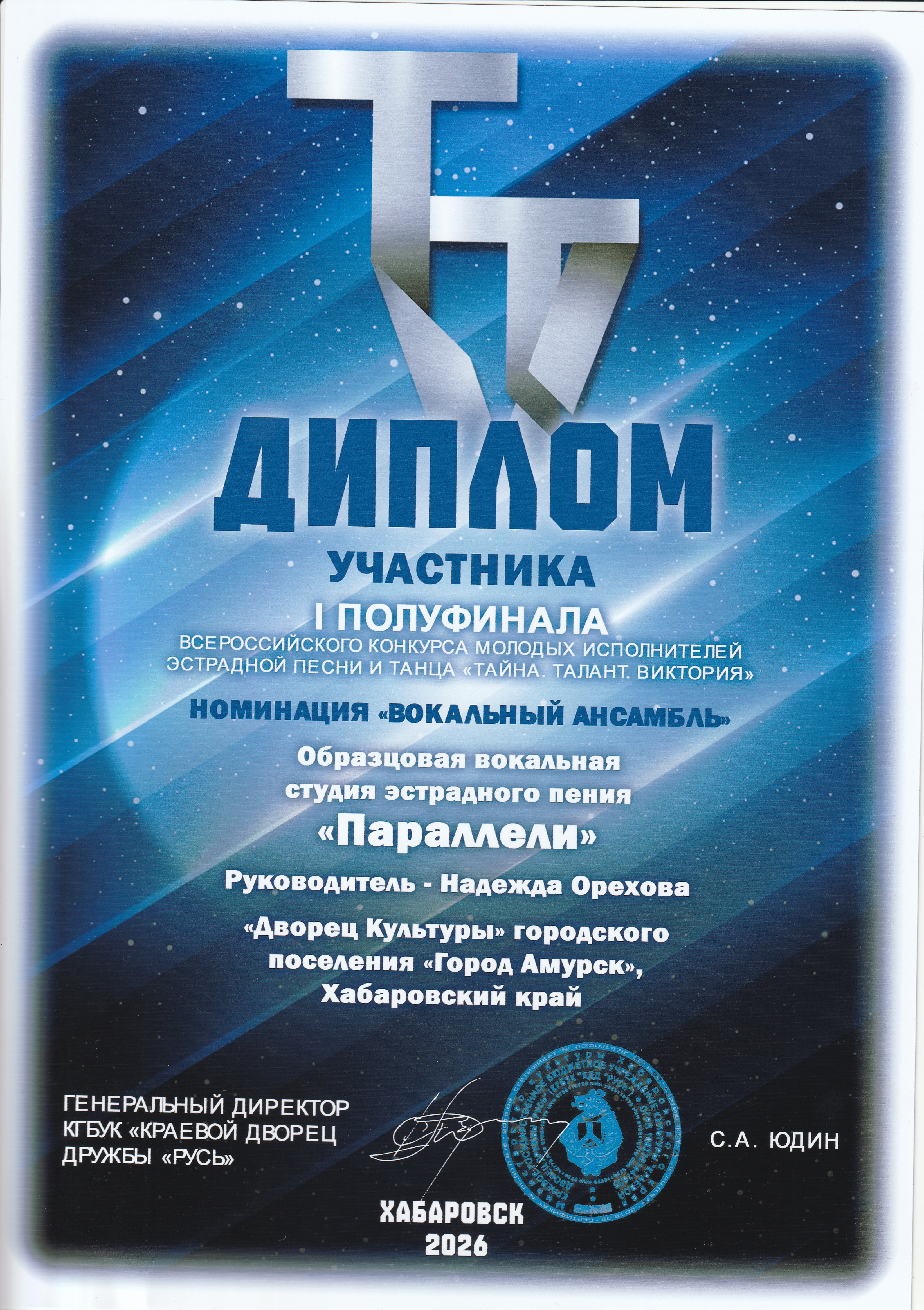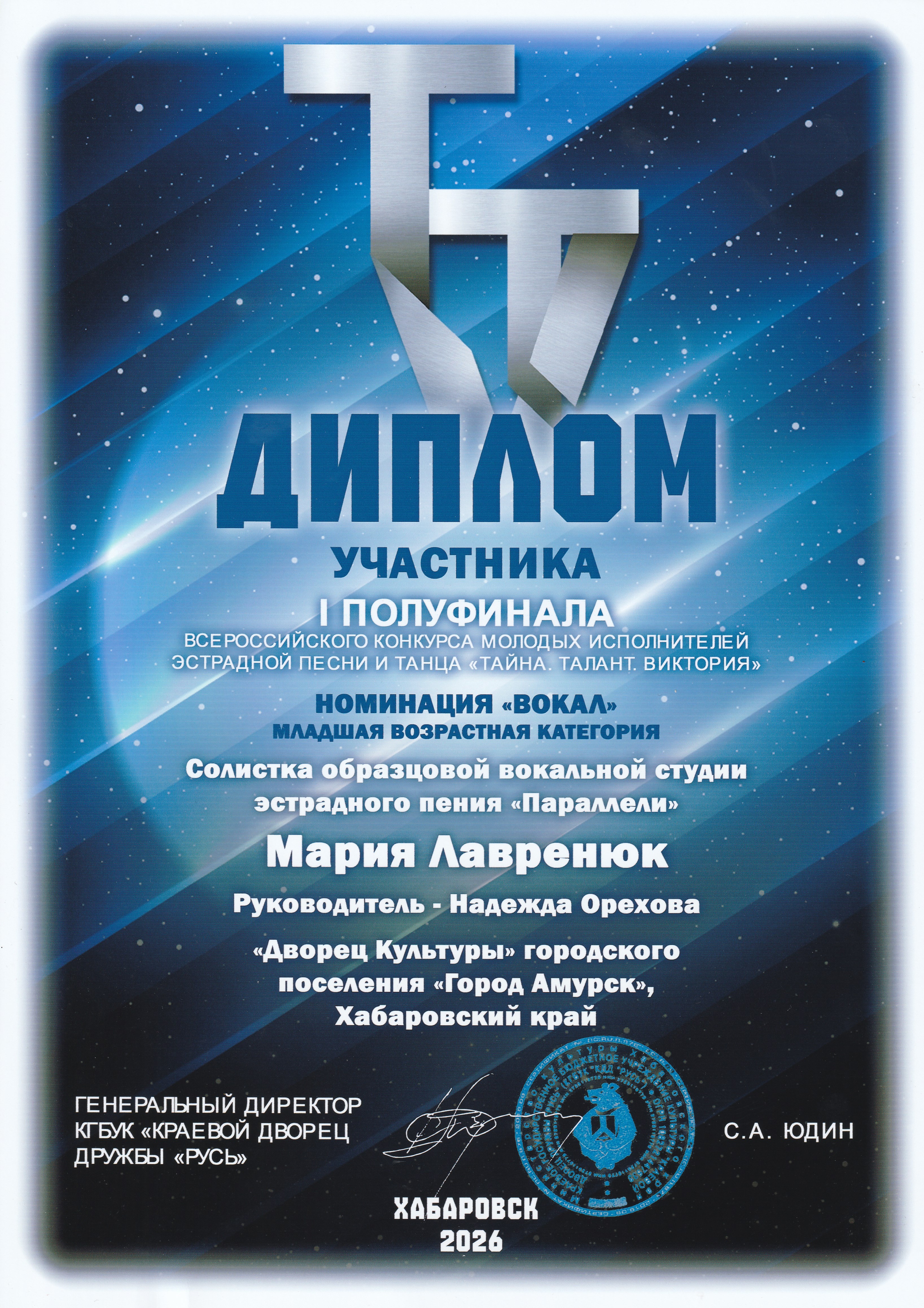 8 февраля более 250 талантливых участников из Хабаровского края, ЕАО и Сахалинской области показали невероятное мастерство в вокале, оригинальном жанре и хореографии в I Полуфинале Всероссийского конкурса молодых исполнителей эстрадной песни и танца «Тайна. Талант. Виктория» организатор конкурса КДД «Русь» г. Хабаровск, при поддержке Министерства культуры Хабаровского края.